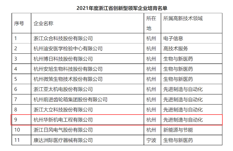 近日,浙江省科學(xué)技術(shù)廳發(fā)布了《關(guān)于公布2021年浙江省創(chuàng)新型領(lǐng)軍企業(yè)名單的通知》,華新機(jī)電憑借持續(xù)提升的自主研發(fā)與科技創(chuàng)新實力,成功入選“2021年度浙江省創(chuàng)新型領(lǐng)軍企業(yè)”培育名單。