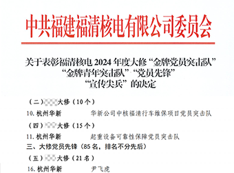 12月18日,福清核電公司黨委發(fā)文表彰了一批2024年度大修“金牌黨員突擊隊(duì)”“金牌青年突擊隊(duì)”“黨員先鋒”“宣傳尖兵”,華新公司福清行車維保項(xiàng)目黨員突擊隊(duì)、起重設(shè)備可靠性保障黨員突擊隊(duì)被評(píng)為“金牌黨員突擊隊(duì)”,黨員尹飛虎被評(píng)為“大修黨員先鋒”。這是業(yè)主對(duì)華新公司以及具體項(xiàng)目團(tuán)隊(duì)的充分肯定。